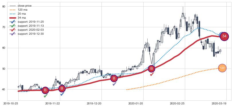 上涨趋势2019-10-25-2020-03-19,均线34确认关键支撑4处