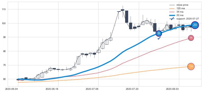 上涨趋势2022-04-29-2022-08-10,均线34确认关键支撑1处