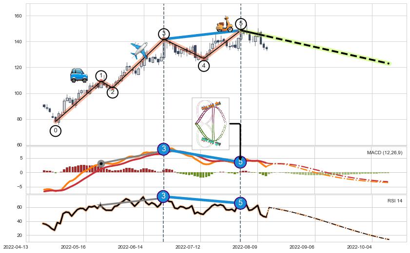| 3 🅚:下跌两颗星 | 下跌三颗星 ➕ 🌊:波浪理论猜想上涨浪5已形成,猜想后续形成回调abc下跌(均值回复) ☞ 看空信号 ⇥ 【🅚线】交织【图形】⇥ 综合量化分数: 49 | > |
