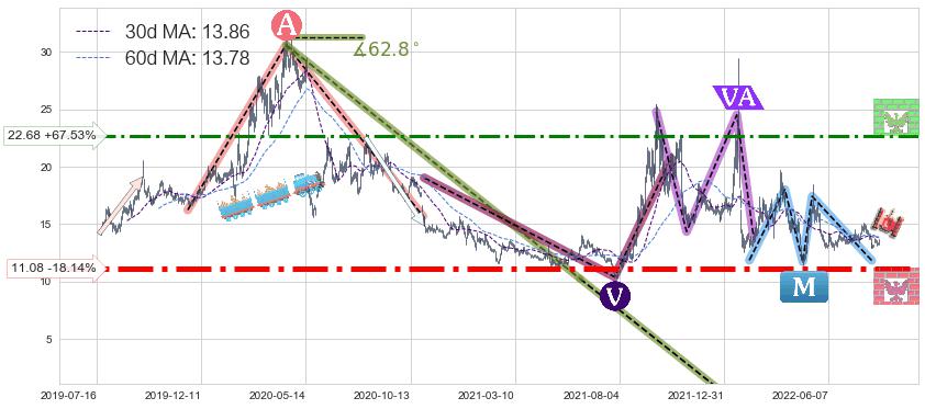 ♘ 阻力价格位22.68,可信任强度57.43%,距离最后交易2022-08-12形成的收盘价格13.54相差 +67.53%