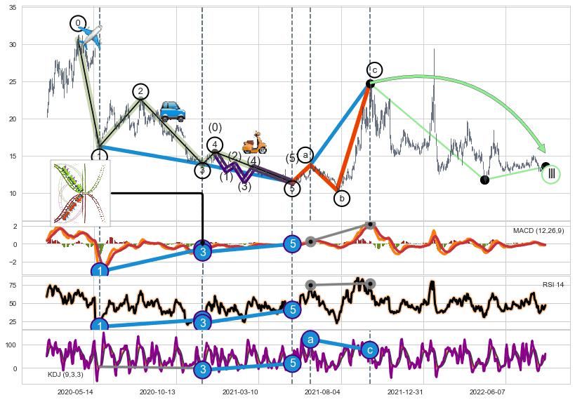 ➣ 1,3,5驱动浪MACD, RSI, KDJ走势都出现【常规背离】反转信号增强