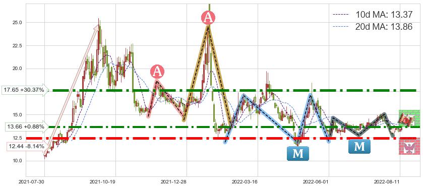 ♘ 阻力价格位13.66,可信任强度80.21%,距离最后交易2022-08-12形成的收盘价格13.54相差 +0.88%