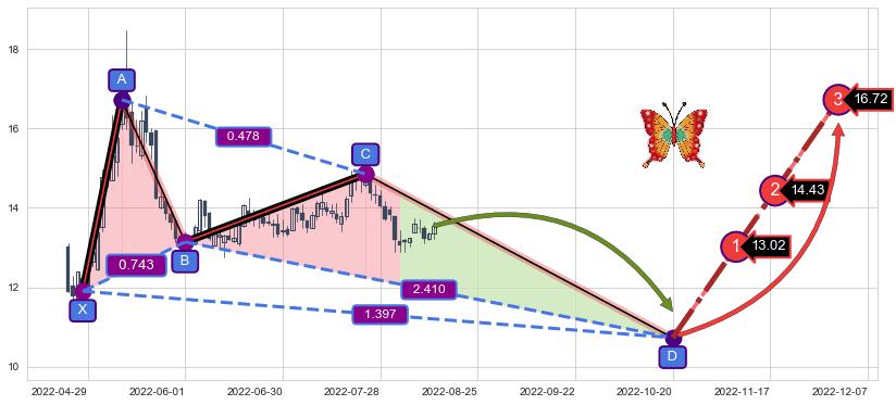 ➣ 未完成【蝴蝶】形态起点X: 2022-04-28, 已到达C点: 2022-07-25, 预测最终D点: 2022-10-20, 共115交易日