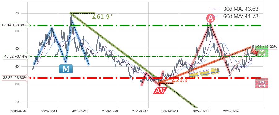 ♘ 支撑价格位33.37,可信任强度96.53%,距离最后交易2022-08-12形成的收盘价格45.46相差 -26.60%