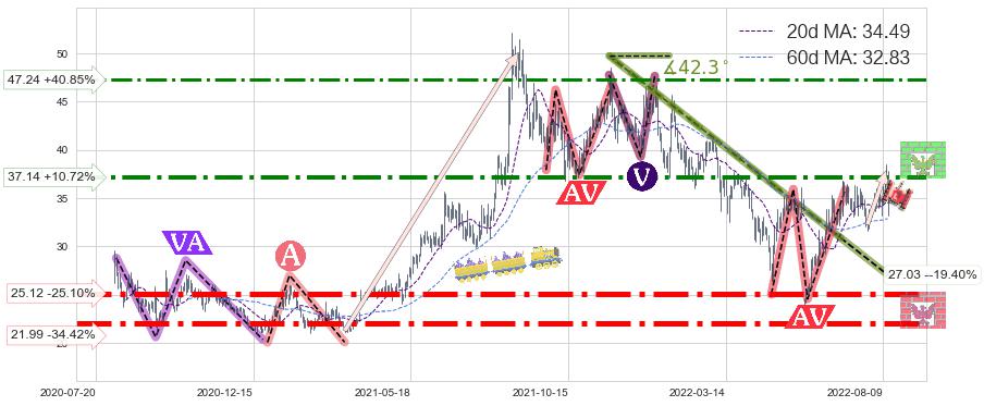 ♘ 阻力价格位37.14,可信任强度83.70%,距离最后交易2022-08-12形成的收盘价格33.54相差 +10.72%