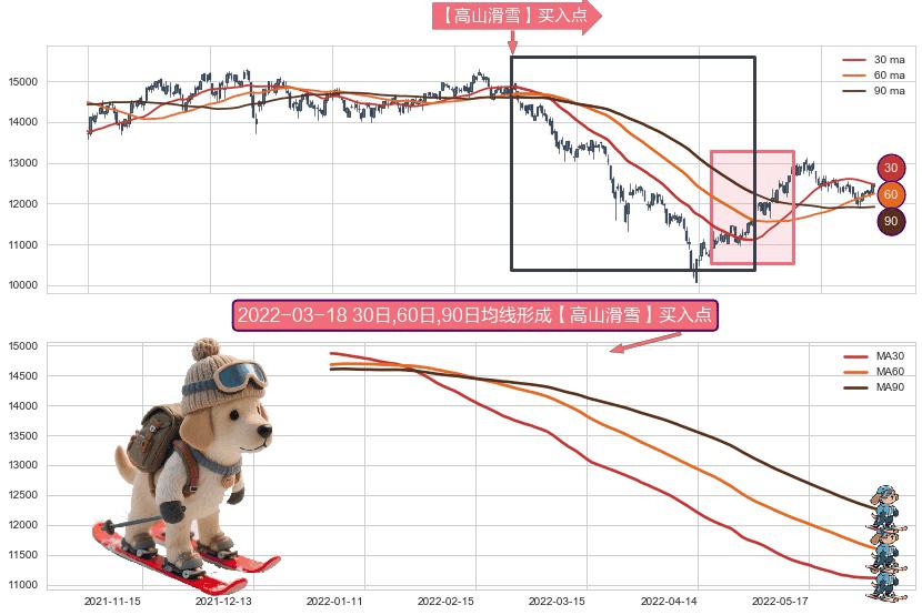 ⚀ 2021-12-31日-2022-06-02日显现 30日-60日-90日均线 【高山滑雪】买入点 看多信号,后市看涨,买入