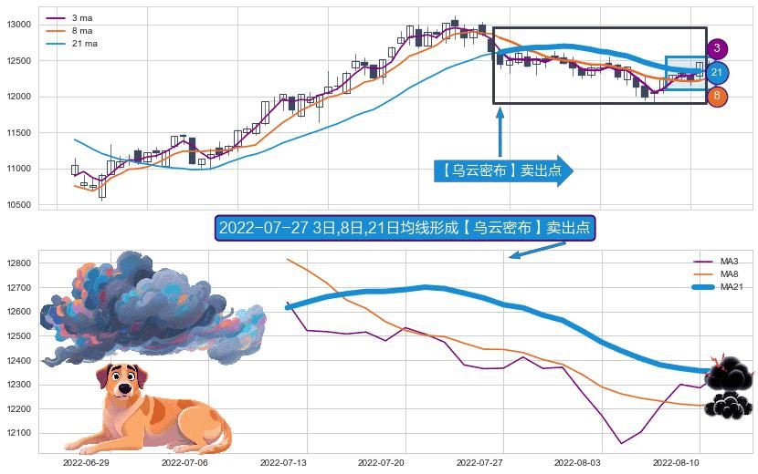 ⚀ 2022-07-12日-2022-08-11日显现 3日-8日-21日均线 【乌云密布】卖出点 看空信号,后市看跌,卖出