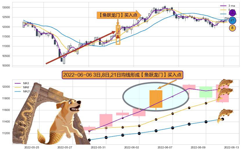 ⚀ 2022-06-06日显现 3日-8日-21日均线 【鱼跃龙门】买入点 看多信号,后市看涨,买入