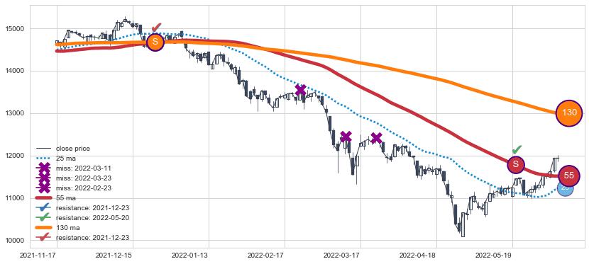 ⚄ 价格在均线遇到阻力后已再次向下回落了【较长】距离, 第⑦卖出点 阻力效果得到【初步确认】