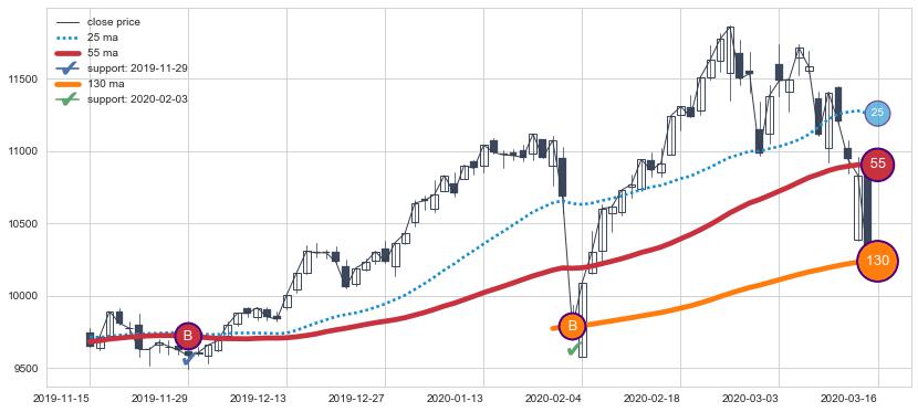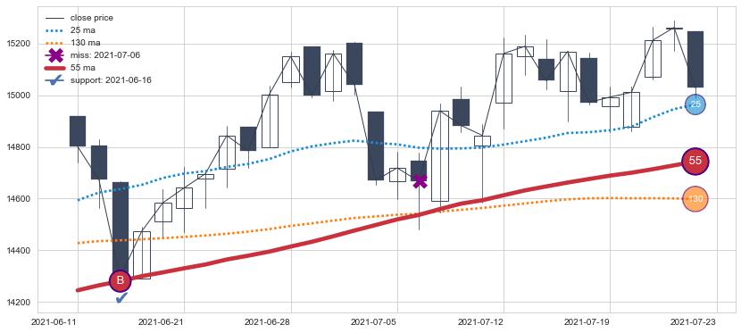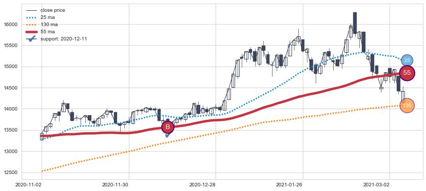 ⚁ MA3和MA8走势平行,且始终保持在短距离内,MA21始终在短中期均线上方,与短中期均线保持一定的距离,微微下行
