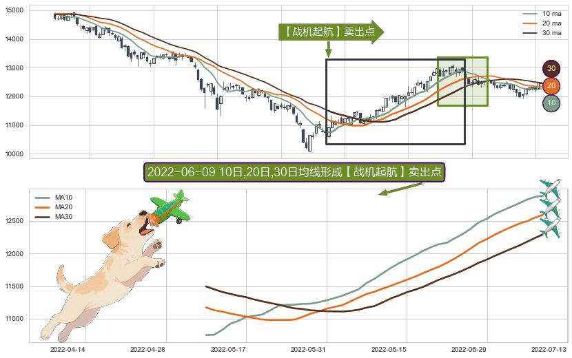 ⚀ 2022-05-10日-2022-07-08日显现 10日-20日-30日均线 【战机起航】卖出点 看空信号,后市看跌,卖出