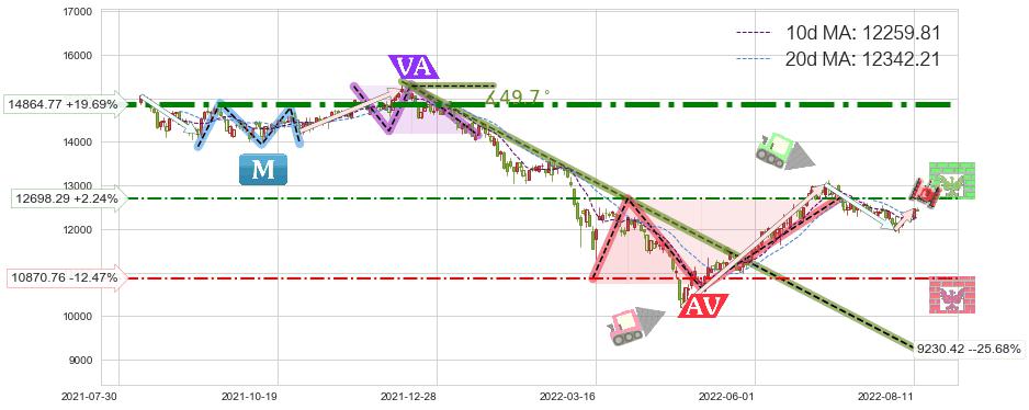 ♘ 阻力价格位12698.29,可信任强度46.09%,距离最后交易2022-08-12形成的收盘价格12419.80相差 +2.24%