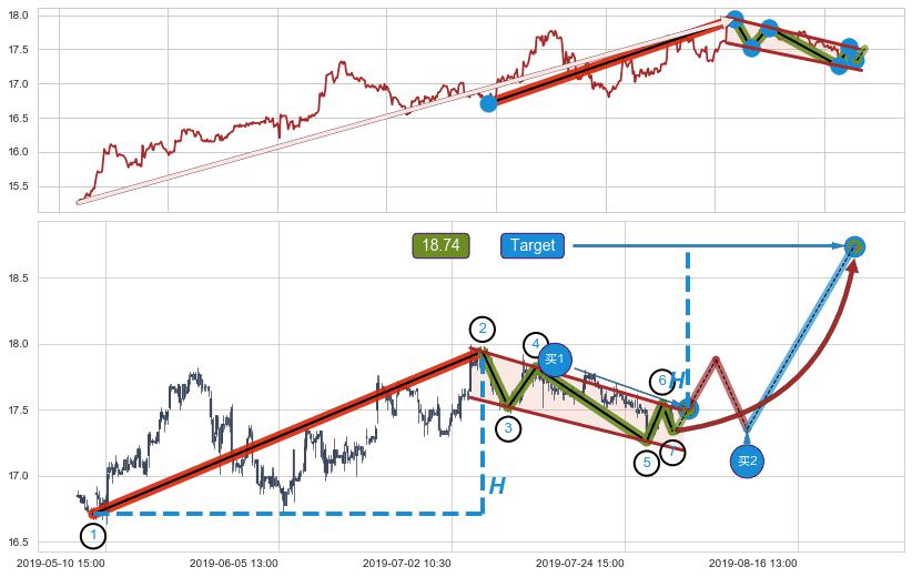 🍖 长线趋势跟踪组合短线均值回复[强支撑信号]2019-01-31 13:00-2019-07-09 13:00上升趋势依然成立(上涨趋势跟踪依然可行),短线价格略微下行回调(均值回复猜想),即将接近趋势提供的未破位的支撑价格:17.52。