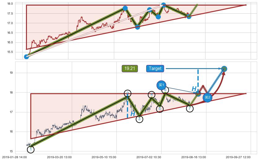 ➣ 上升三角整理:猜想临近关键阻力位突破点 → 临近拐点上涨 → 机会信号 → 大趋势均值回复