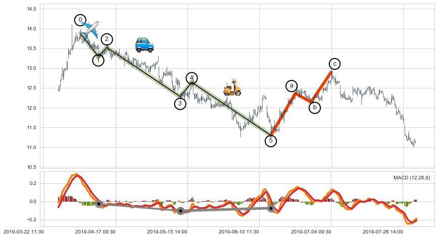 ➣ 第一, 三, 五浪下跌动能逐渐【衰弱变小】,趋势呈现不稳迹象