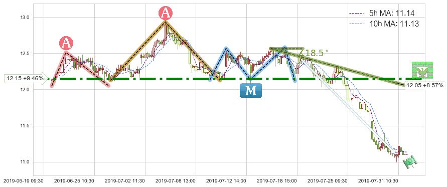 2019-07-15: 时域附近第一阻力位12.15持续的对下跌趋势进行阻拦,有效地放缓了下跌的速度。