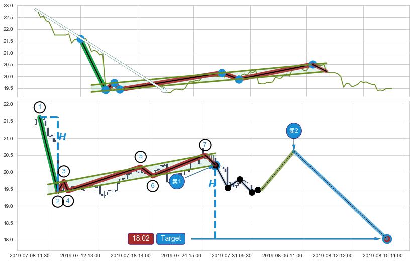 从2019-06-27 14:00至2019-07-02 15:00,共包含14个小时,阶段股价上涨3.64%,阶段股价变动位移路程比: 1 : 2