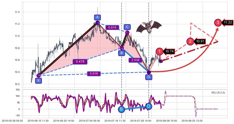 ➢ 谐波蝙蝠:c下跌到达d:猜想拉升 → 上涨 →【拐点】强支撑临近 → 大趋势均值回复