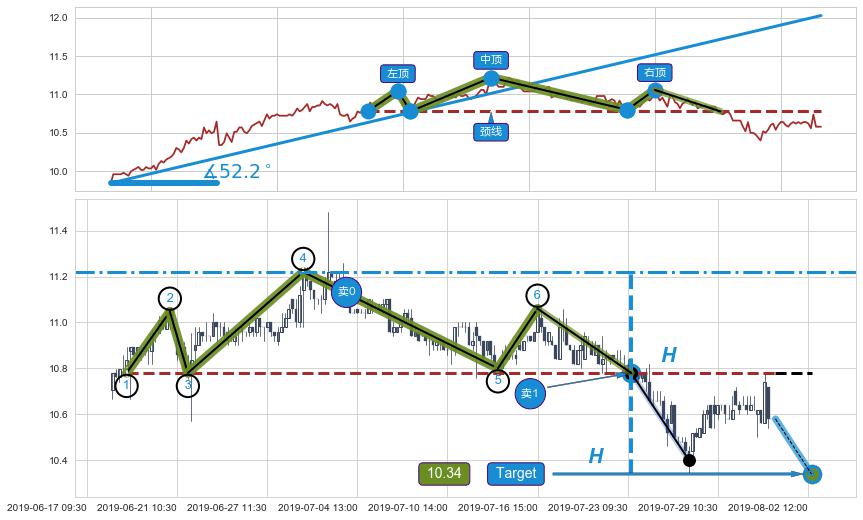 从2019-06-21 14:00至2019-07-16 15:00,共包含98个小时,阶段股价上涨2.64%,阶段股价变动位移路程比: 1 : 10