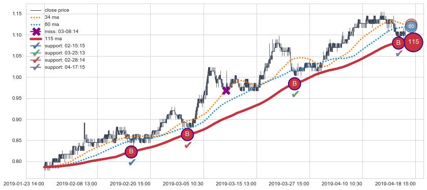 ➢ 最优均线组合共正确确认支撑阻力信号19处,正确确认率 65.52%