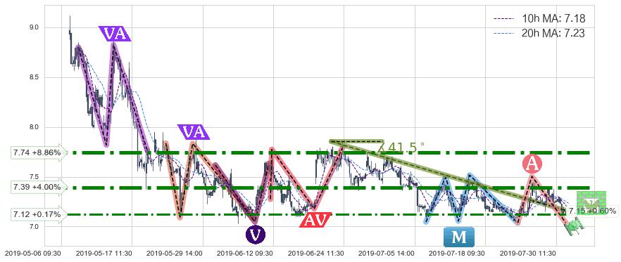 ♘ 阻力价格位7.39,可信任强度85.90%,距离最后交易2019-07-31 15:00形成的收盘价格7.11相差 +4.00%