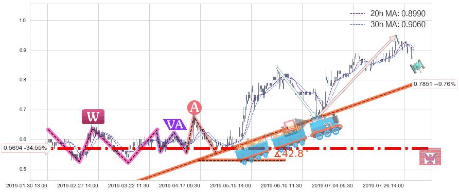 从2019-06-17 09:30至2019-07-31 15:00,共包含192个小时,阶段股价上涨27.97%,阶段股价变动位移路程比: 1 : 5