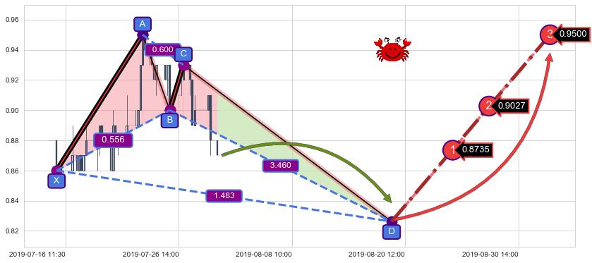 ➣ 未完成【螃蟹】形态起点X: 07-15:14, 已到达C点: 07-29:09, 预测最终D点: 08-19:12, 共147交易小时