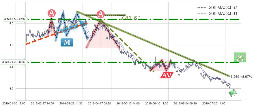 从2019-03-19 10:30至2019-07-31 15:00,共包含539个小时,阶段股价下跌-42.78%,阶段股价变动位移路程比: 1 : 6,下跌趋势角度: 41.6