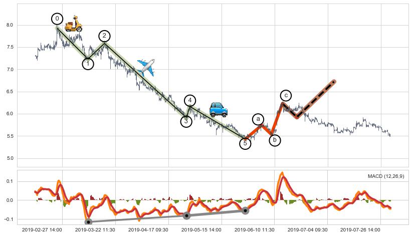 ➢ 波浪理论:猜想达到c点后小反弹终止反转下跌 → 下跌 → 【拐点】临近 → 阶段均值回复结束后继续大周期趋势跟踪