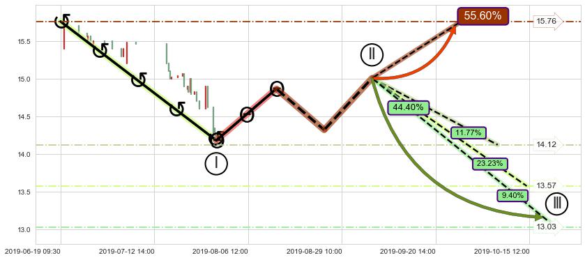 ➣ 循环浪继续向下【平均值】位置(10-14:15, 13.57),匹配聚类样本比例52.33%, 可能性概率23.23%