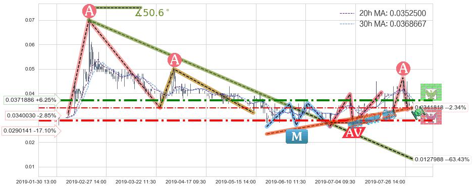 ➢ 预测:2019-08-01 14:00,【小幅回撤】稳定目前上涨趋势的前提下,预测价格:0.0343636