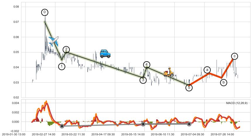 ➢ 波浪理论:猜想击穿突破c点后继续上涨 → 上涨 → 机会信号 → 小趋势跟踪
