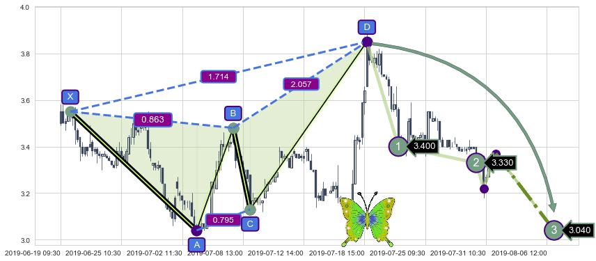 ➣ 已完成【蝴蝶】形态起点X: 06-19:14, 终点D: 07-19:09, 共123交易小时