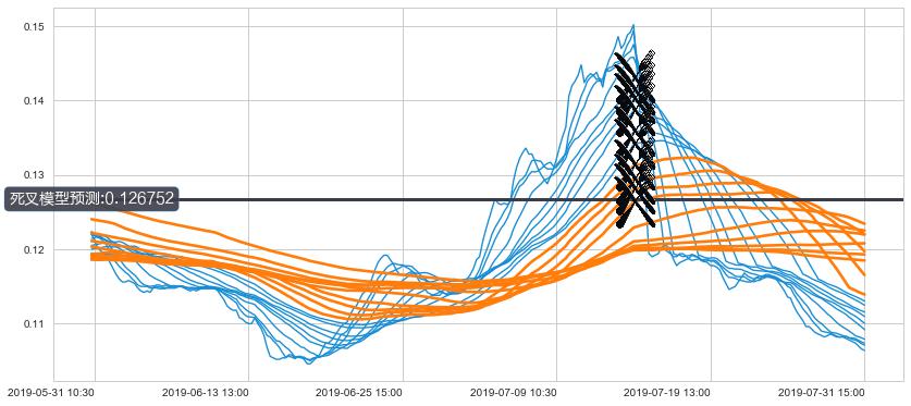 ➣ 60小时均线于(07-15 11:30: 0.134117)形成【死叉】基于【死叉历史模型】预测死叉后最低波谷价格: 0.125374, 死叉后最低价格0.106000,已经下跌超出预测最低波谷价格, 预期反弹