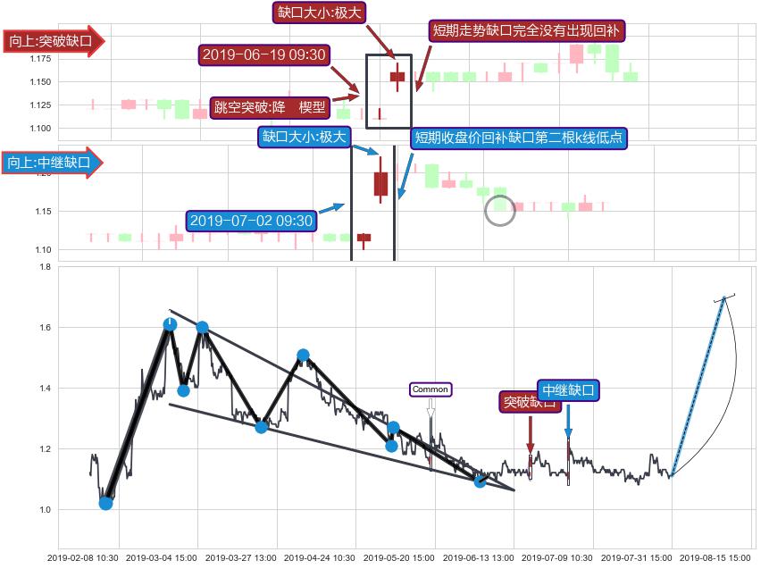 ➢ 跳空突破降🚩楔型关键点后,后续非关键走势也无缺口回补迹象,突破缺口可信度提高
