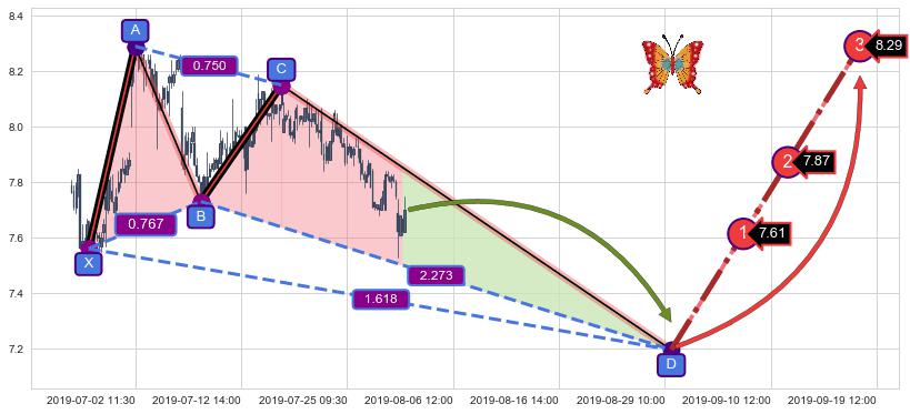 ➢ 未完成【蝴蝶】形态起点X: 06-25:14, 已到达C点: 07-17:15, 预测最终D点: 08-29:13, 共273交易小时
