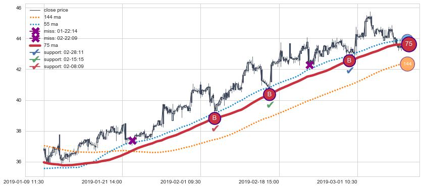 03-07 15:00至03-26 10:30 慢线与快线多次接触,存在上下穿越,有缠绕