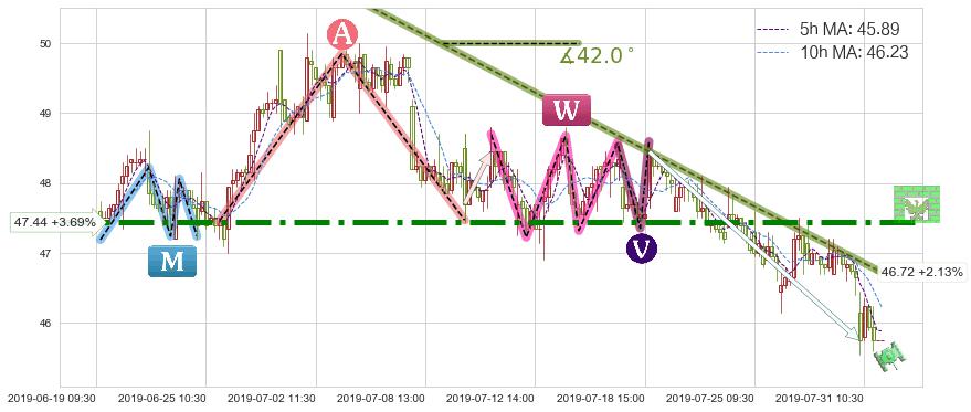 ➣ 预测:2019-08-07 15:00,【继续下探】稳定目前下跌趋势的前提下,预测价格:44.95