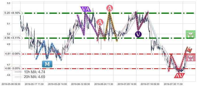 ♘ 阻力价格位5.20,可信任强度96.82%,距离最后交易2019-07-31 15:00形成的收盘价格4.81相差 +8.16%