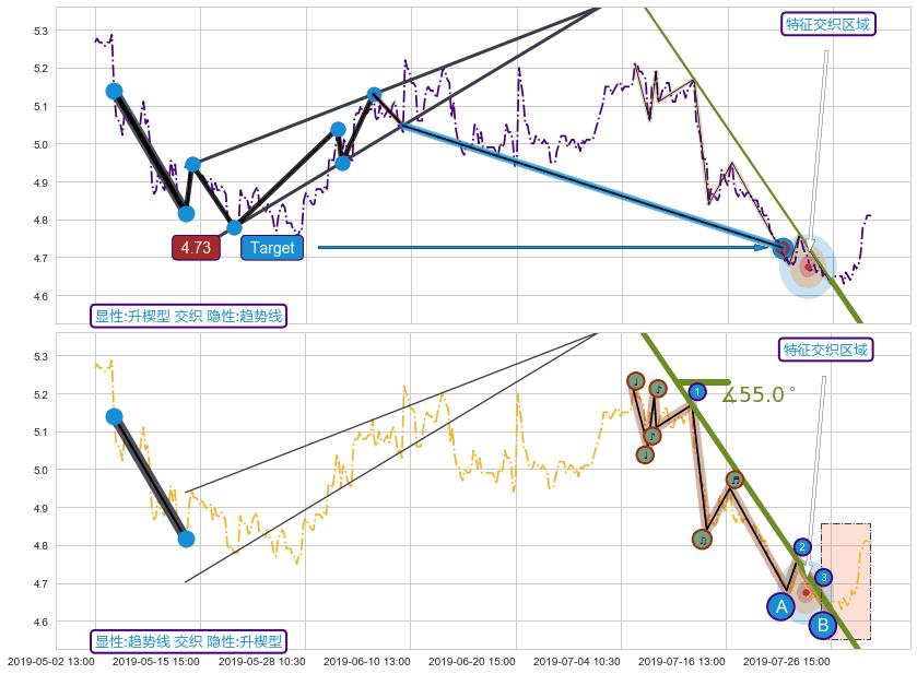 从2019-07-23 11:30至2019-07-31 15:00,共包含40个小时,阶段股价上涨2.78%,阶段股价变动位移路程比: 1 : 4