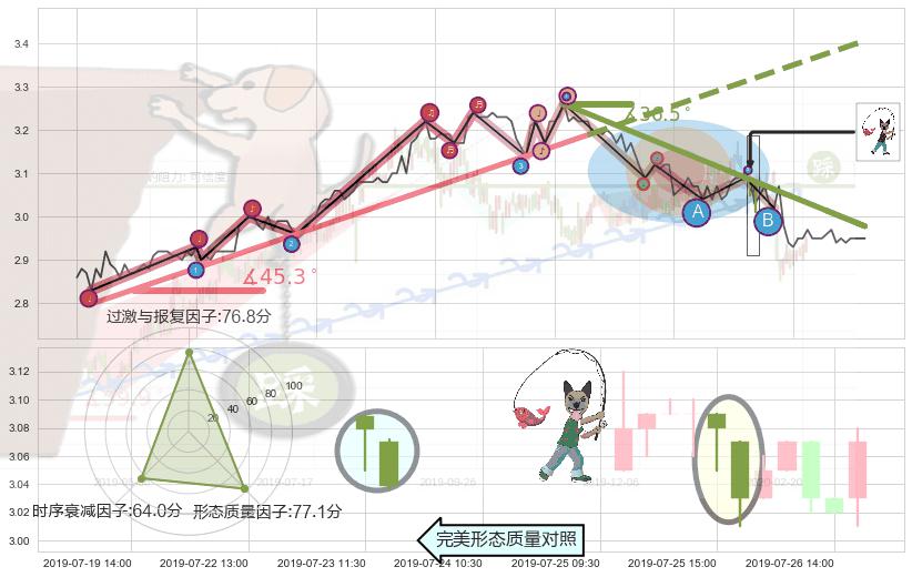 ➣ 2019-06-21 15:00-2019-07-18 10:30上升趋势存在反转[风险],其原上升趋势的支撑位(3.406)已破位[强阻力信号],原上升趋势角度: 45.3˚