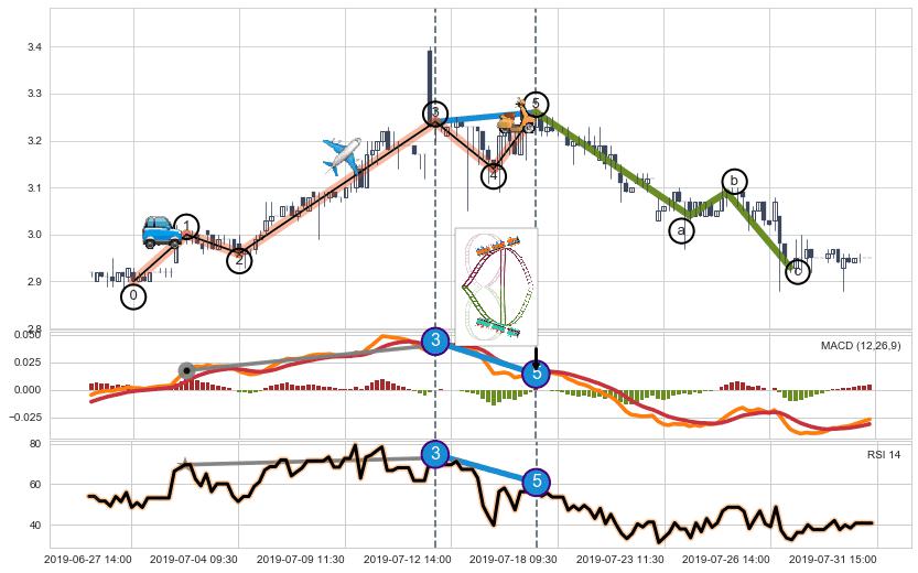 从2019-07-10 09:30至2019-07-12 10:30,共包含14个小时,阶段股价上涨2.22%,阶段股价变动位移路程比: 1 : 2
