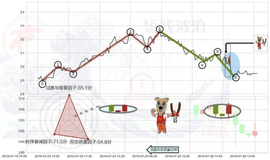 ➢ 🕰 价格走势在2019-07-23 10:30:00至2019-07-23 11:30:00期间形成顶部尽头线(下山虎),残存影响值:-2.92