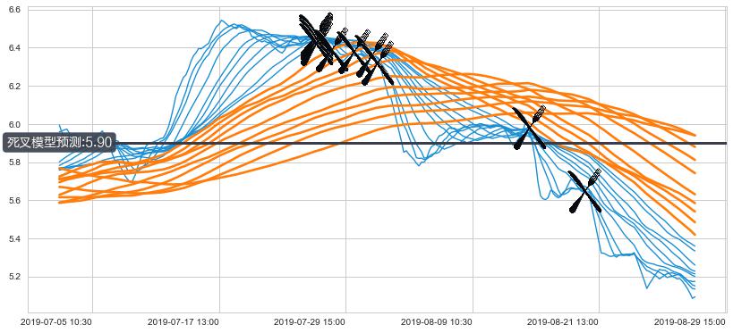 ➣ 30小时均线于(08-14 15:00: 5.98)形成【死叉】基于【死叉历史模型】预测死叉后最低波谷价格: 5.73, 死叉后最低价格5.07,已经下跌超出预测最低波谷价格, 预期反弹