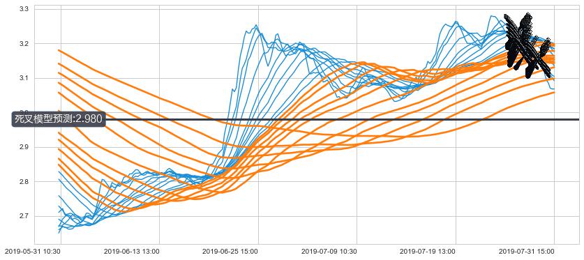 ➣ 55小时均线于(07-26 15:00: 3.212)形成【死叉】基于【死叉历史模型】预测死叉后最低波谷价格: 3.061, 死叉后最低价格3.060,虽然已经到达预测最低波谷价格,但耗时间很短动能很强, 预期继续下跌