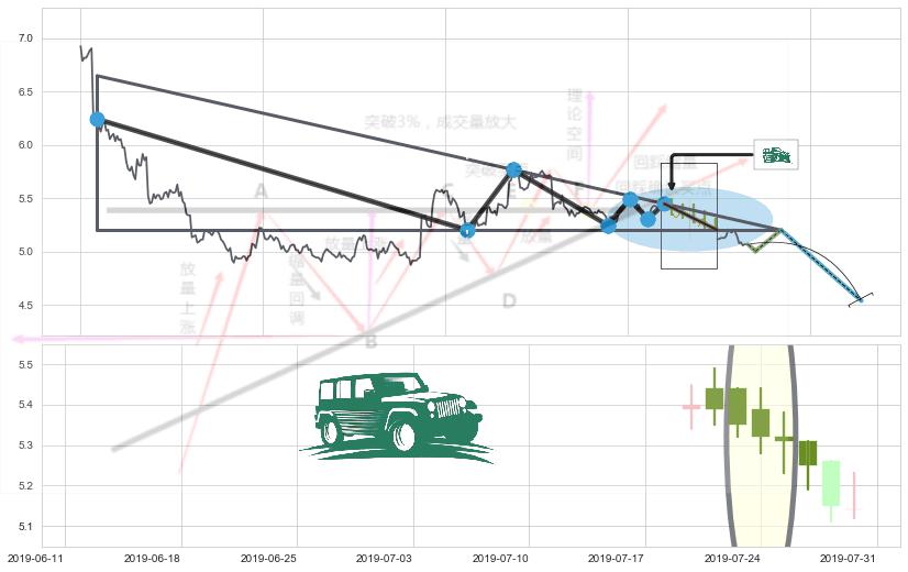 从2019-07-22 10:30至2019-07-31 15:00,共包含47个小时,阶段股价下跌-7.14%,阶段股价变动位移路程比: 1 : 2