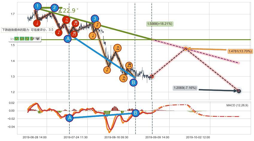 ♘ 在最后的下跌阶段2019-06-24 09:30至2019-08-21 14:00,存在 持续未破位的阻力位 ,阻力价格1.5368,可信任强度80.05%,其距离最后价格1.3000相差 +18.21%
