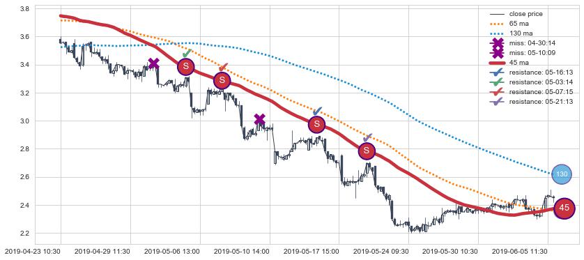 04-23 11:30至06-05 14:00 慢线与快线呈空头排列, 慢线与快线接触少,无缠绕