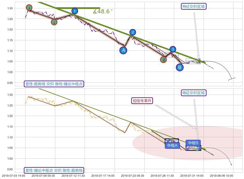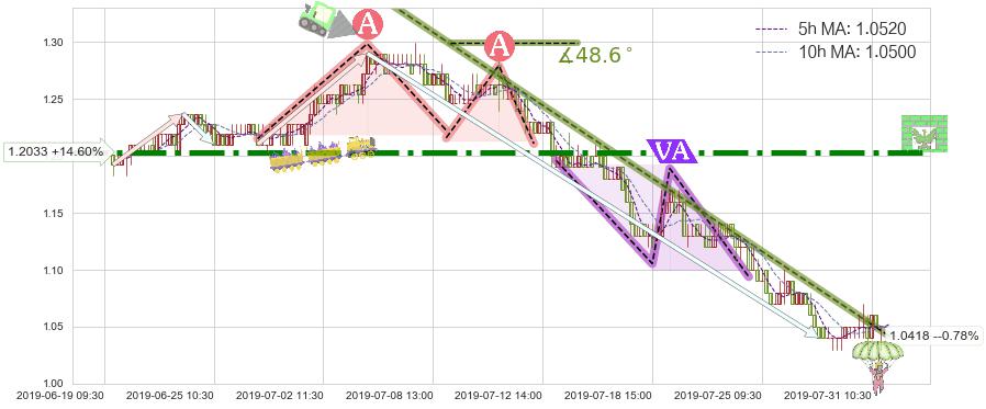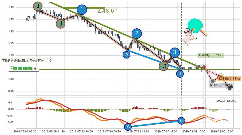 🦴 长线均值回复组合短线趋势跟踪[强阻力信号]2019-07-04 09:30-2019-07-31 09:30下跌趋势依然成立(下跌趋势跟踪依然存在),短线价格略微上行反弹(均值回复猜想),即将接近下跌趋势提供的未破位阻力价格:1.0418。
