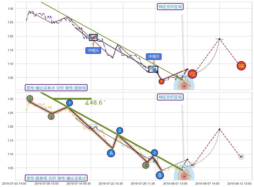 ➣ 缠论中枢点:猜想破位中枢B后持续下拉 → 下跌 → 破位中枢B支撑 → 持续趋势跟踪